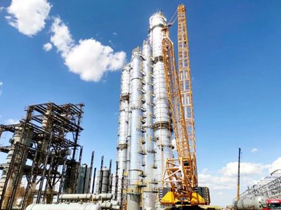 按工藝需要,乙醇裝置共設置12臺塔器,二甲醚單元3臺,羰基化單元1臺,加熱爐單元1臺,加氫及產品分離單元7臺。目前累計完成塔器吊裝就位9臺,剩余塔器預計8月底前全部安裝就位。