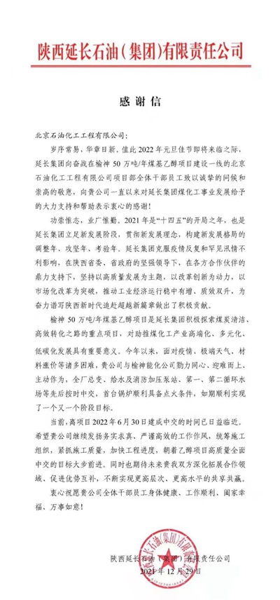 在北京石油化工工程有限公司總承包的延長石油榆神能化50萬噸/年煤基乙醇項目緊鑼密鼓、加快建設的關鍵時期,12月29日,陜西延長石油(集團)有限責任公司向我公司發(fā)來感謝信,對我公司2021年乙醇項目建設工作給予了充分肯定和高度評價。