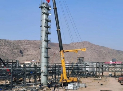 近日,由北京石油化工工程有限公司EPC總承包的內蒙東景BDO項目丁二醇主裝置低沸塔緩緩起吊,經過2個小時的緊張施工,穩穩地吊裝到指定位置上。