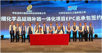 6月20日,呼和浩特興泰新材料科技有限公司新型精細化學品延鏈補鏈一體化項目簽約儀式暨設計開工會在新材料公司舉行。北京石油化工工程有限公司黨委書記兼董事長許緘濤、冠達企業有限公司總裁萬明東、久泰集團總裁崔軼鈞出席簽約儀式并講話。久泰集團副總裁、新材料公司董事長王總鎮主持簽約儀式。