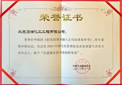 北京石油化工工程有限公司榮獲“黨建強企優(yōu)秀案例特等獎”。公司持續(xù)夯實黨建基礎(chǔ),塑強黨建品牌,筑牢紅色堡壘,打造特色黨建文化,營造濃厚黨建氛圍。