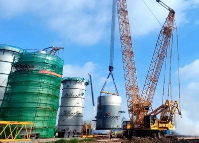 目前,DMC裝置主框架鋼結(jié)構(gòu)開(kāi)始安裝,同時(shí)一塔、三塔下段裙座已吊裝就位。兩塔直徑均為8米,高度分別為66.08米和66.7米,重量為455噸和411噸,此次吊裝采用600噸履帶吊,分四段制造及四段吊裝。 為確保順利吊裝,業(yè)主、監(jiān)理、總包、施工單位召開(kāi)多次吊裝專(zhuān)題會(huì),結(jié)合場(chǎng)地實(shí)際情況,研討制定吊裝方案,嚴(yán)格按照操作要求進(jìn)行施工。在各方人員密切配合下,高質(zhì)量完成了本次吊裝任務(wù)。