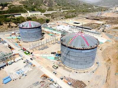 據悉,作為LNG儲罐建設過程中最具挑戰性的環節,“氣壓升頂”工藝難度高、風險高。本次實施氣頂升的1號、2號儲罐采用先進的雙金屬全容結構,外罐內直徑達52米,拱頂跨度51.8米。在歷時2小時18分鐘的精密操作中,成功將單體重達457.37噸的儲罐穹頂平穩提升29.57米,最終實現與承壓環的精準對接,為后續3號、4號儲罐穹頂升打下堅實基礎。