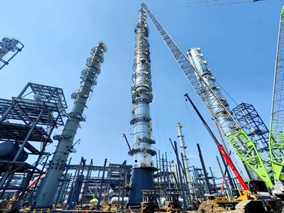 乙醇塔是本項目核心設備,直徑4.8米,高度116米,總重380噸,分4段進場組對。尤其最后吊裝的上段設備長達25米、重達126噸,吊裝難度大,精度要求高。面對場地條件受限、惡劣天氣等不利因素,項目組與各參建方精心策劃、周密部署,通過科學管理,在38天窗口期內高效完成包括超高、超重塔器及反應器的安裝,為項目的全面推進創造了有利條件。