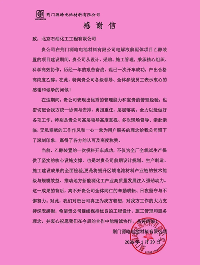 1月26日,北京石油化工工程有限公司(簡稱:北油工程)總承包的荊門源晗乙醇裝置一次性開車成功,順利產(chǎn)出合格高純度乙醇,標(biāo)志著該項目建設(shè)任務(wù)圓滿收官、實現(xiàn)階段性重大突破。荊門源晗特向北油工程發(fā)來感謝信,對公司各級領(lǐng)導(dǎo)及項目團隊在裝置建設(shè)期間的傾力支持、卓越管理和辛勤付出,致以衷心感謝與誠摯問候。